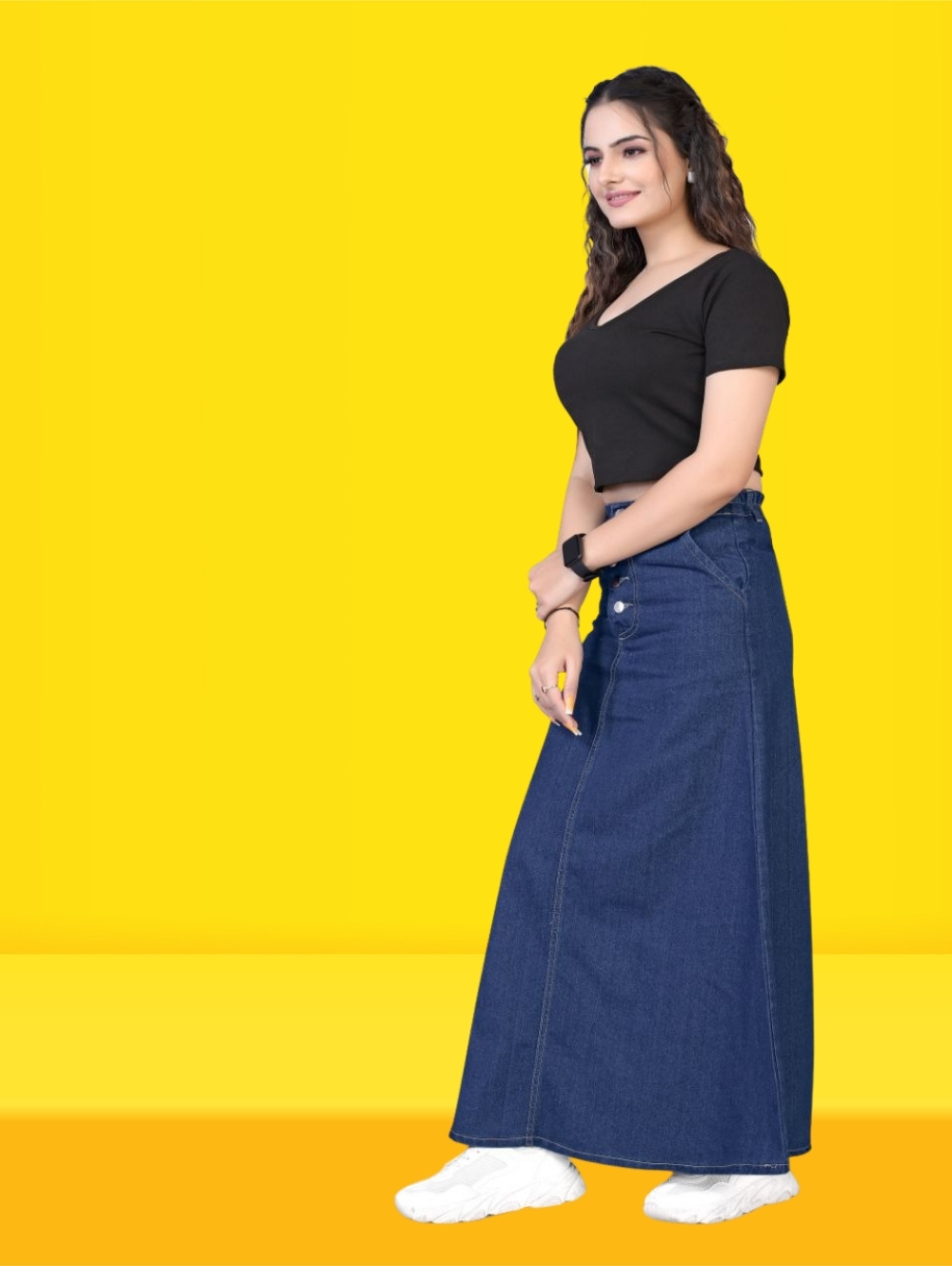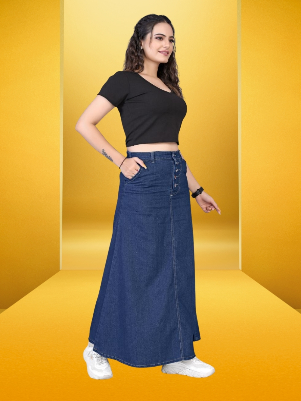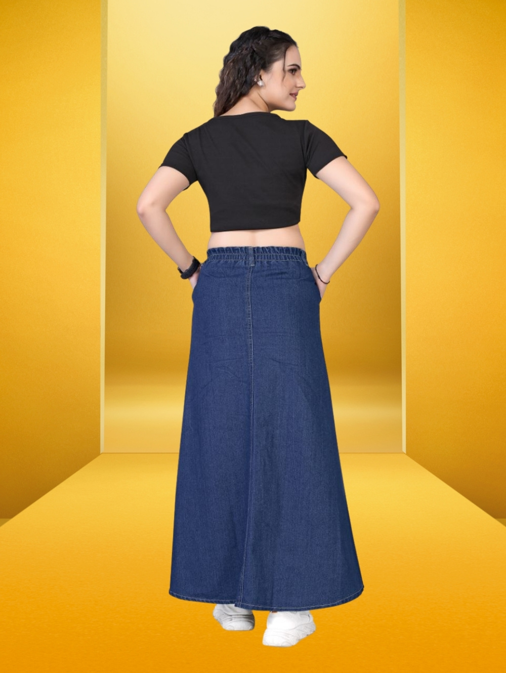 Stunning modest denim skirt, made from 95% cotton and 5% Spandex, offers both comfort and style. This ankle-length skirt features 37-inch length