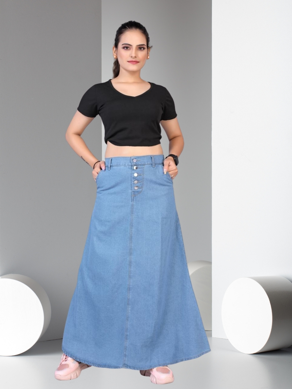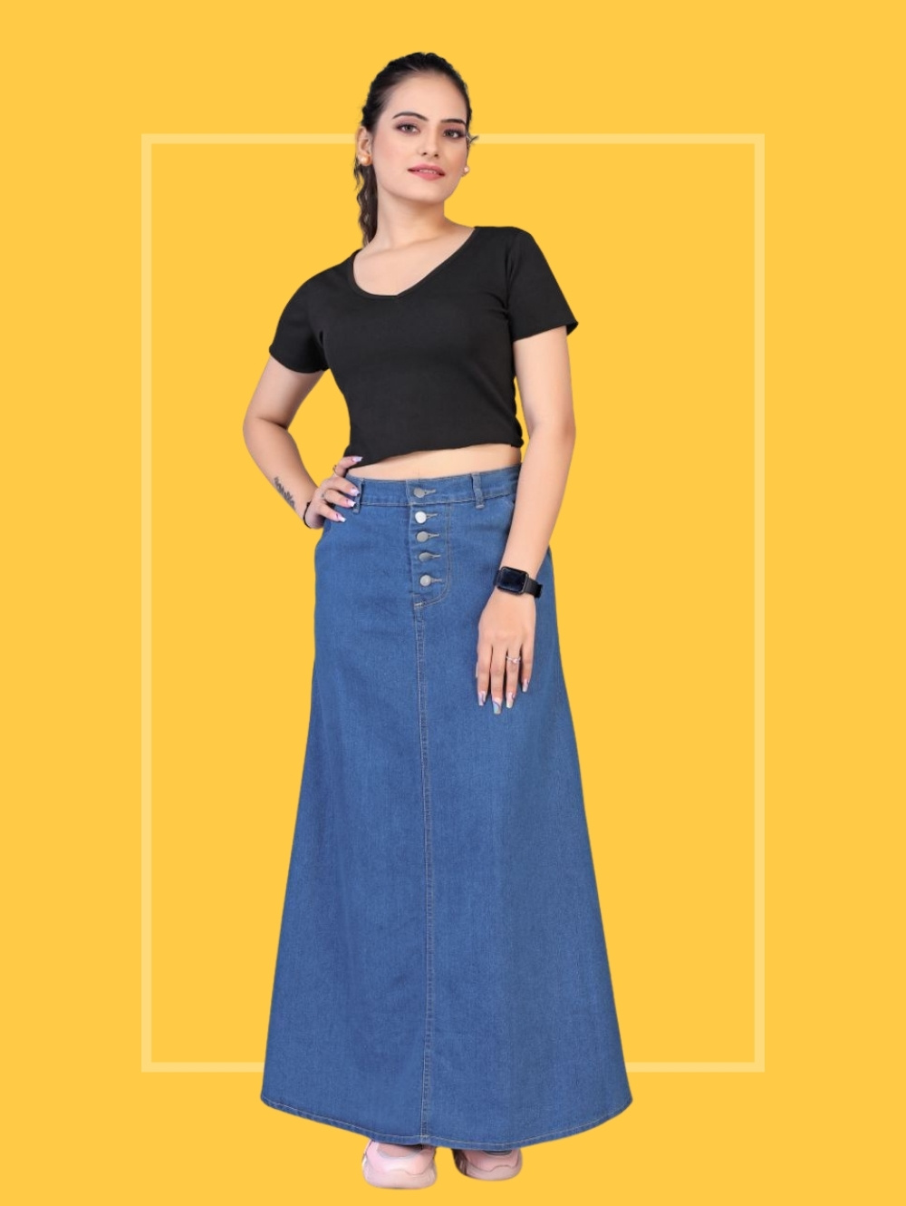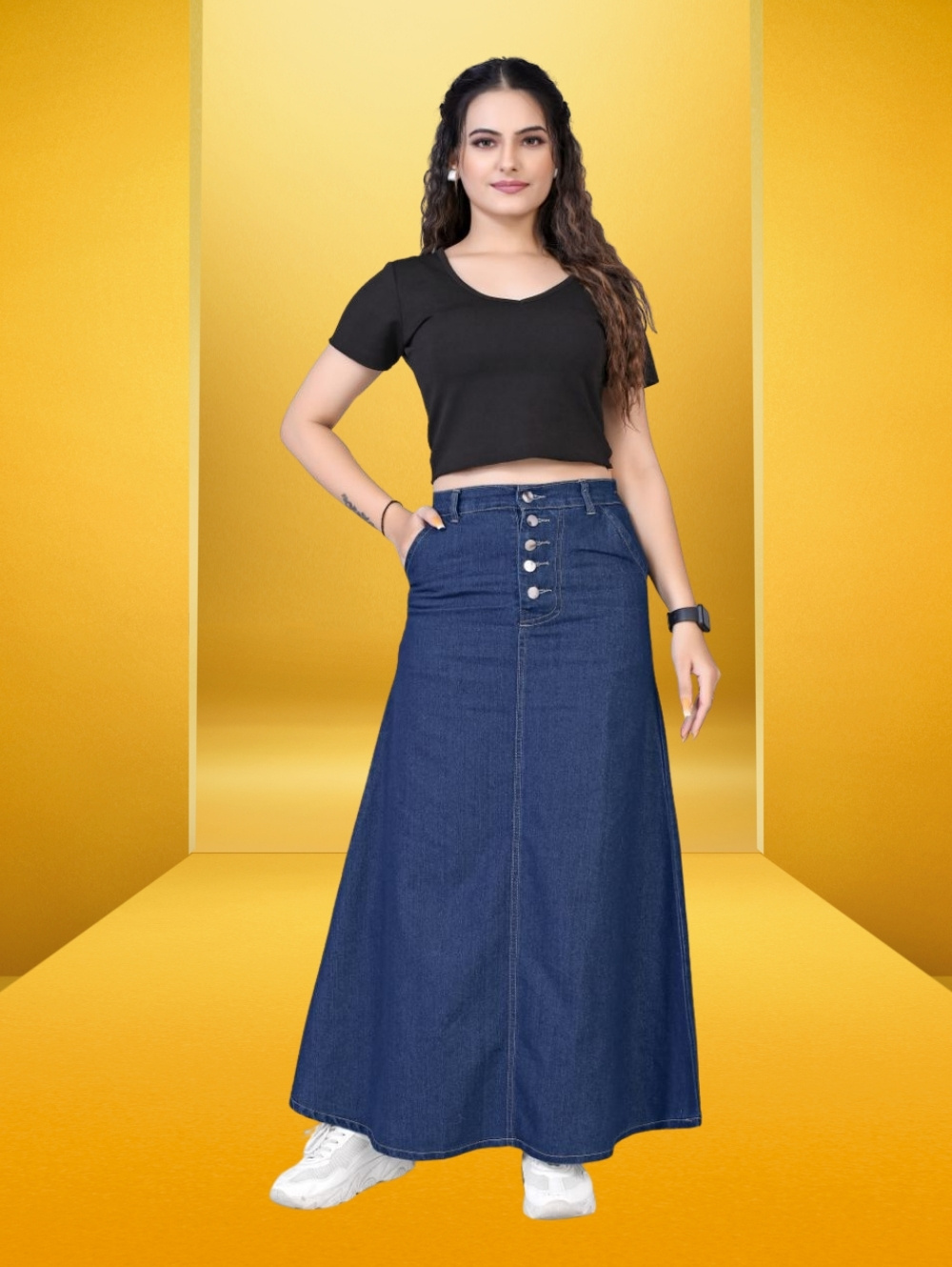 Stunning modest denim skirt, made from 95% cotton and 5% Spandex, offers both comfort and style. This ankle-length skirt features 37-inch length